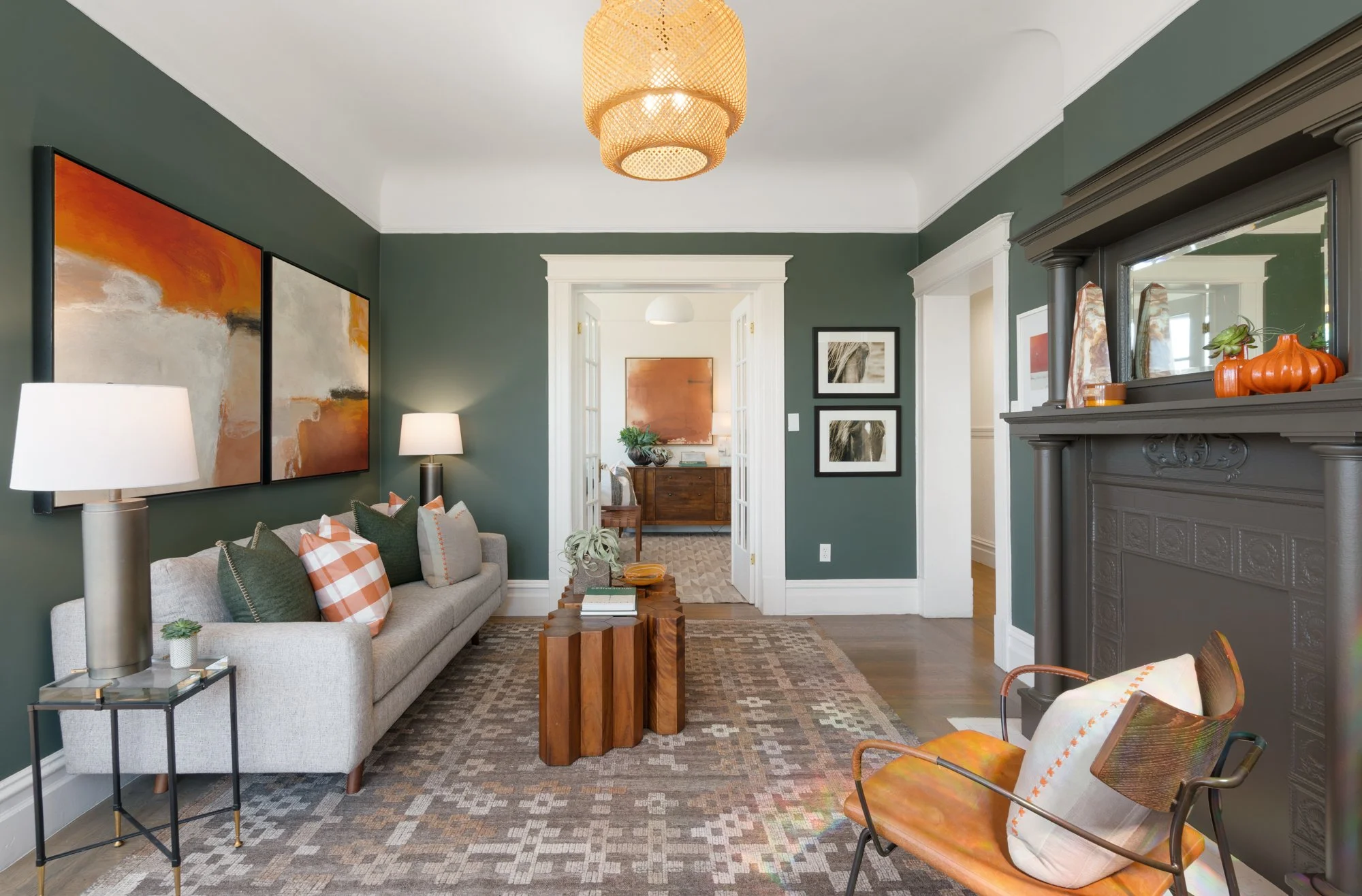 Inside, discover high ceilings, classic bay windows, original hardwood floors, and a decorative fireplace adorned with intricate detailing and a built-in mirror. The bright and spacious living room looks out at views of Bernal Hill and Twin Peaks, filling the home with warmth and natural light.